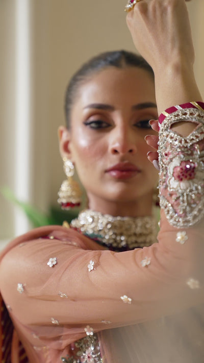 This ethereal Front Open net kalidar jacket exudes elegance, featuring intricate silver and gold zardozi work with delicate hints of plum for a touch of richness. Layered over a hand-embroidered choli, the design flows into a pleated flared lehenga, creating a dramatic and graceful silhouette. Paired with an embellished net dupatta finished with a scalloped border, this ensemble is perfect for making a statement at festive events or weddings, blending tradition with a modern, sophisticated flair.
