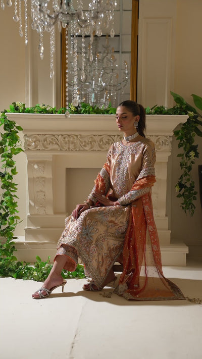 This exquisite rose gold pure lama outfit features intricate silver and antique zardozi botanical embroidery, adorned with sparkling Swarovski stone details. The monotone resham work adds subtle elegance, while the ensemble is paired with a luxurious lama tissue izaar embellished with fine detailing. The back showcases a stunning cut-out with detailed embroidery, adding a striking element. Paired with a coral gold Indian tissue dupatta, heavily embellished and featuring ornate work on all sides, the look is completed with handcrafted tassels for a perfect finish.