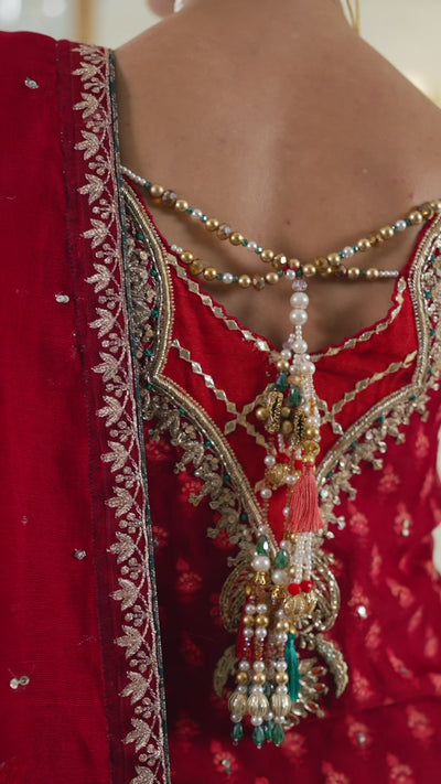 This stunning deep red block-printed outfit is richly adorned with intricate gota and gold zardozi work, offering a festive appeal. Hints of orange, coral, and seagreen add a vibrant pop of color to the ensemble, while handcrafted tassel details at the back elevate its elegance. Paired with a silk net dupatta featuring gota florals and sequin embellishments, the look is completed by a khaadi silk crushed lehenga adorned with delicate gota ribbon detailing, creating a perfect balance of tradition and modern flair.