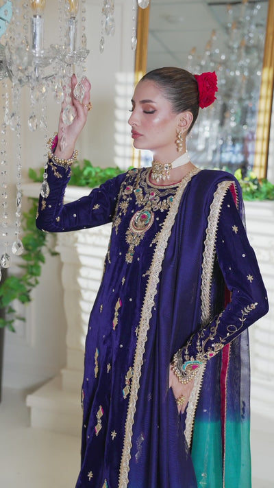 A perfect blend of traditional elegance and trendy style, this velvet shirt features zardozi and gota embroidery with vibrant pops of pink and Teal. Stylized gota motifs embellish the shirt, adding a contemporary flair, while handcrafted tassels at the back bring a festive charm. Paired with sea green jamawar izaar pants, adorned with gota embellishments, and a two-tone dupatta with pink finishing, this ensemble strikes a beautiful color balance, making it a fun and festive choice for celebratory occasions.