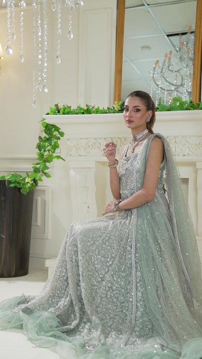 Crafted from sequin-embellished embroidered net this stunning pale mint gown, exudes modern elegance with its sparkly silver and tonal embroidery, adorned with glistening opaque sequins, pearls, and silver zardozi. Pops of lilac and lavender add a refreshing lift to the soft color palette. The gown features heavily handcrafted emerald and silver crystals and pearl tassels, for a fun and stylish touch, all finished with delicate ruffles for added grace. Paired with a heavily embellished net dupatta with intricate work on all sides, this ensemble is a chic and contemporary choice for weddings and festive celebrations.