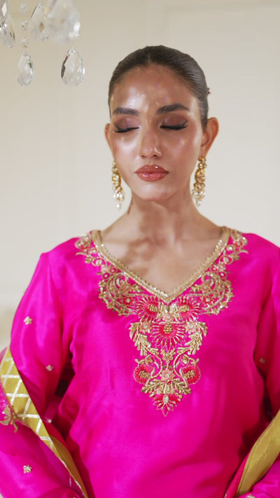 This striking fuchsia raw silk outfit features a chic short shirt with a flared pant , beautifully embellished with intricate zardozi and resham embroidery in detailed floral patterns. The vibrant hue is further enhanced by the opulent embroidery, creating a stunning visual impact. Paired with an organza dupatta adorned with stylized gota motifs, this ensemble is finished with dhanak-embellished color-block borders & hand crafted tassels that adds a playful yet elegant touch.