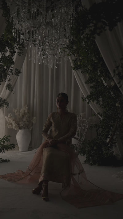 A show-stopping gold A-line ensemble in opulent zari silk, richly detailed with shimmering gota, kamdani, and zardozi embroidery. Styled with a gota-embellished dupatta and tailored straight pants, it features handcrafted tassels at the side hem and a stylish back cut-out, exuding modern elegance with a couture finish.
