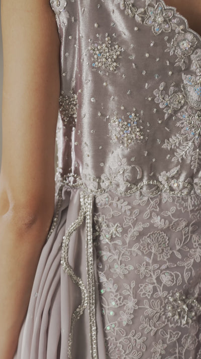 This ethereal flowy gown features a pre-draped attached dupatta that falls effortlessly, creating a soft, sculpted silhouette. The design is adorned with silver pearls, crystals, sequins, and delicate embellishments, intricately placed to catch light with every movement. Tonal resham embroidery adds depth and texture, blending seamlessly into the fabric for a refined, luxurious finish. A perfect harmony of elegance and modern craftsmanship.
