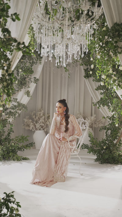 This modern fusion dusty pink ensemble features a stylised drape skirt paired with a sleek tube top, creating a contemporary, sculpted silhouette. The look is elevated with an embroidered front-open jacket, adorned with tonal 3D detailing and rose-gold embroidery, enriched with crystals, beads, pearls, and sequins. A chic, statement-making cut designed for modern muses.
