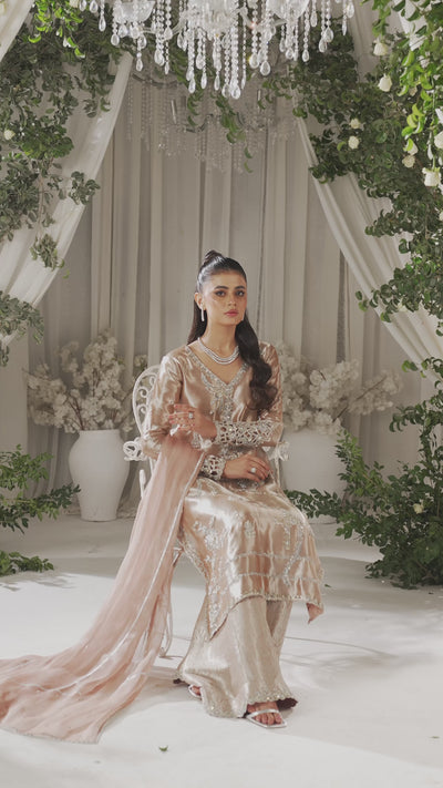 A show-stopping dusty peach pure lame ensemble, adorned with intricate zardozi work, delicate hanging tassel embroidery, and statement floral cut-work sleeves. Sparkling sequins, crystals, and luminous beads catch the light across the luxe canvas, creating a mesmerizing effect. Paired with Atlas Jamawar flared pants and a flowing pure Maysuri dupatta to complete the look.